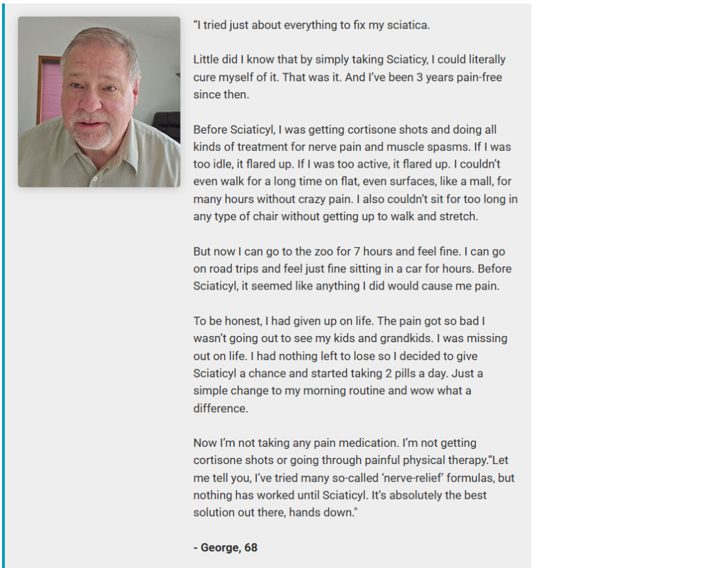 Looking back, the benefits of Sciaticyl went far beyond just “stopping the pain.” It changed the way I see my future. When you live with chronic pain, you stop planning things, but now I feel free again. What surprised me most was how quickly the inflammation subsided, allowing me to get a full night’s sleep without waking up from sharp pains in my leg.